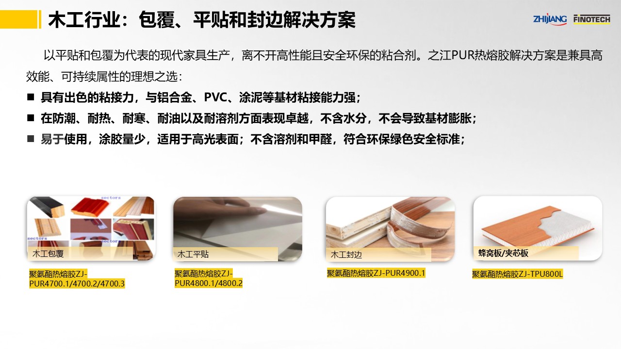 之江公司立足于中國膠粘劑行業(yè)領(lǐng)軍企業(yè)和有機(jī)硅膠、聚氨酯、環(huán)氧等專業(yè)膠粘劑的創(chuàng)新和產(chǎn)業(yè)化優(yōu)勢,具有國家高新技術(shù)企業(yè)和國家級企業(yè)技術(shù)中心資質(zhì),依靠國家級CNAS實(shí)驗(yàn)室以及國家級博士后科研工作站,并有國際專家助力,可為木工行業(yè)提供包覆、平貼、封邊應(yīng)用的聚氨酯熱熔膠粘接解決方案,推出了如下產(chǎn)品: